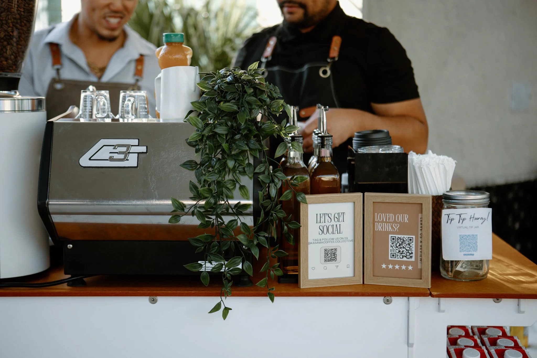 A full espresso bar experience featuring hot and iced drinks, premium flavors, and a beautifully styled cart that complements your celebration.
